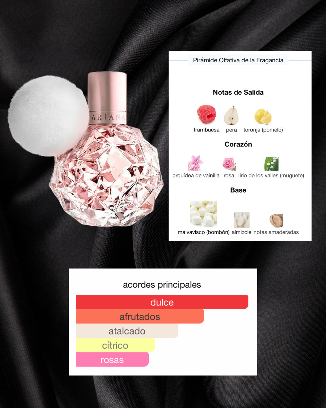 Ari de Ariana Grande es una fragancia de la familia olfativa Floral Frutal Gourmand para Mujeres. Ari se lanzó en 2015. Las Notas de Salida son frambuesa, pera y toronja (pomelo); las Notas de Corazón son orquídea de vainilla, rosa y lirio de los valles (muguete); las Notas de Fondo son malvavisco (bombón), almizcle y notas amaderadas.