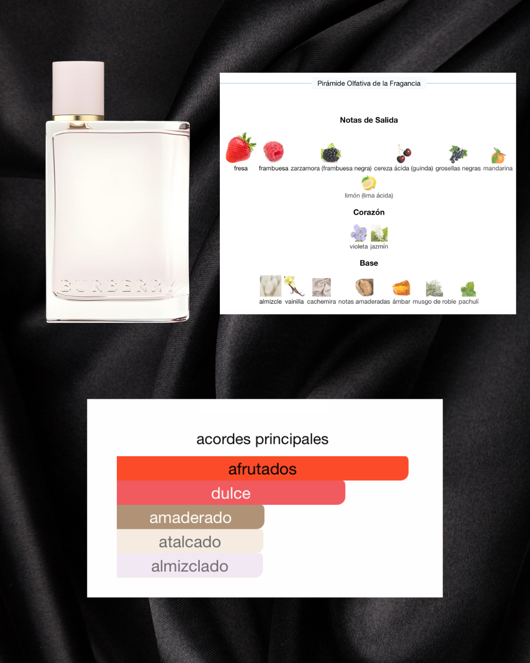 Burberry Her de Burberry es una fragancia de la familia olfativa Floral Frutal Gourmand para Mujeres. Burberry Herse lanzó en 2018. La Nariz detrás de esta fragrancia es Francis Kurkdjian. Las Notas de Salida son fresa, frambuesa, zarzamora (frambuesa negra), cereza ácida (guinda), grosellas negras, mandarina y limón (lima ácida); las Notas de Corazón son violeta y jazmín; las Notas de Fondo son almizcle, vainilla, cachemira, notas amaderadas, ámbar, musgo de roble y pachulí.